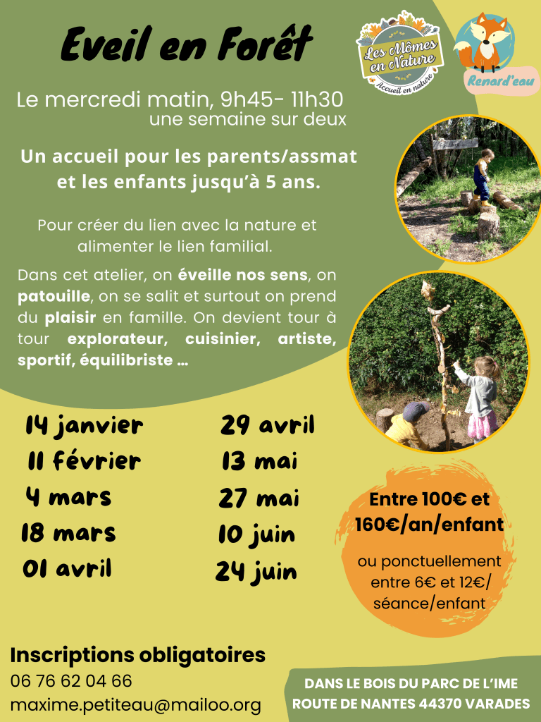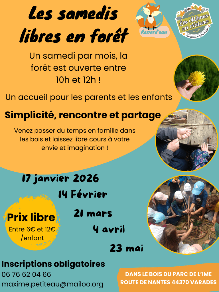 Éveil en forêt le mercredi matin 9h45-11h30 Les samedi libre ne forêt - Un samedi par mois entre 10h et 12h accueil 6-10ans & familles 2026